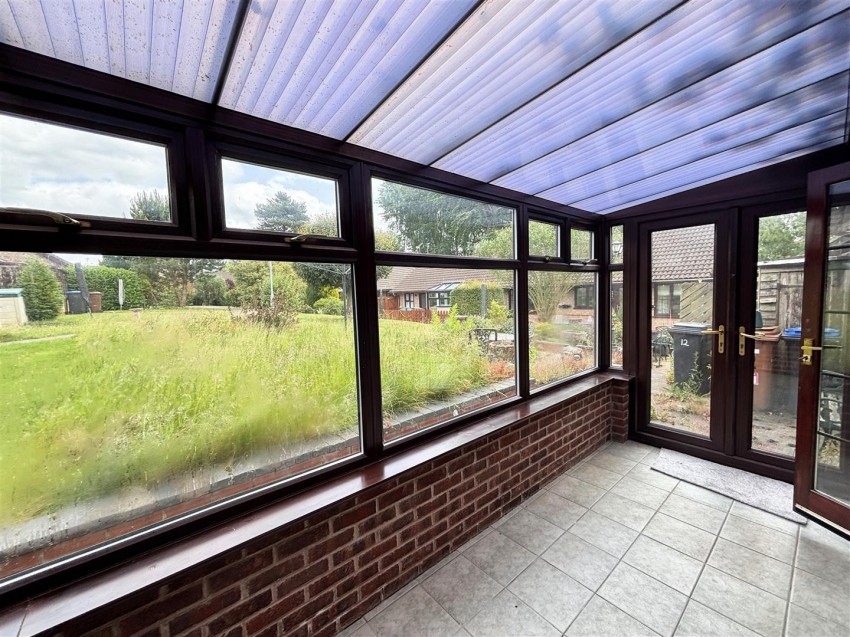 UPVC double glazed conservatory with brick base, polycarbonate roof, tiled flooring, electric storage heater. Double opening French doors out to rear garden.